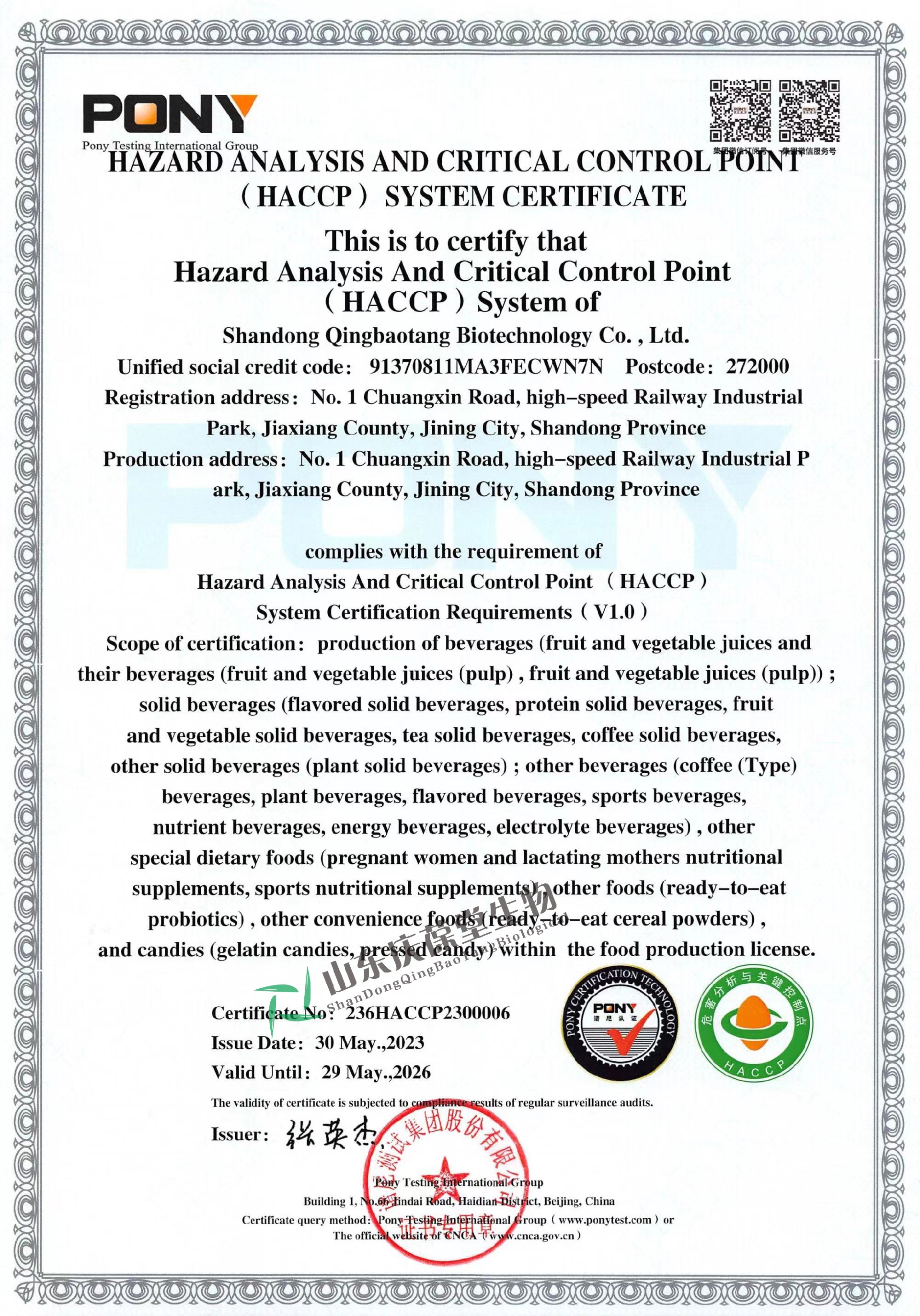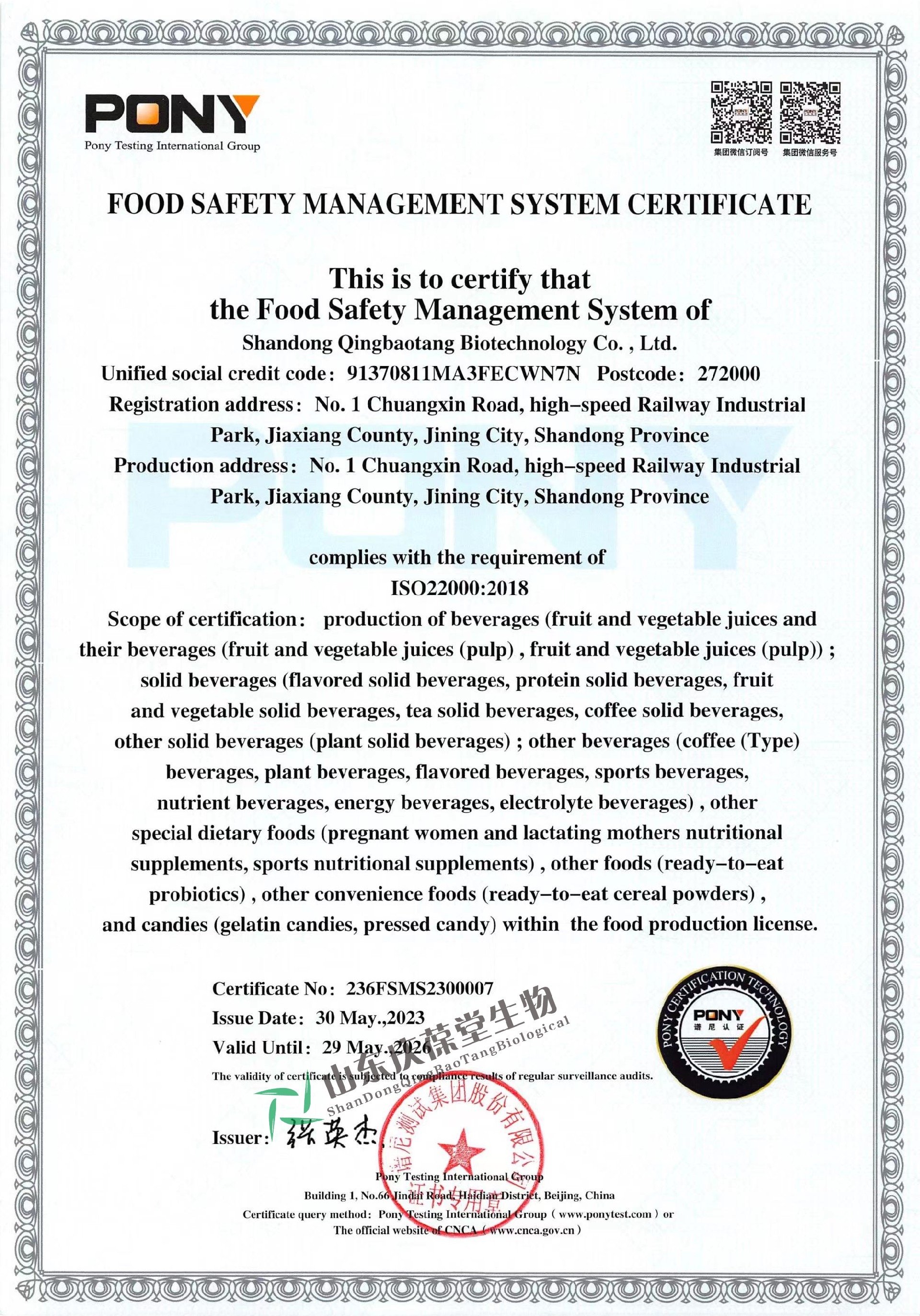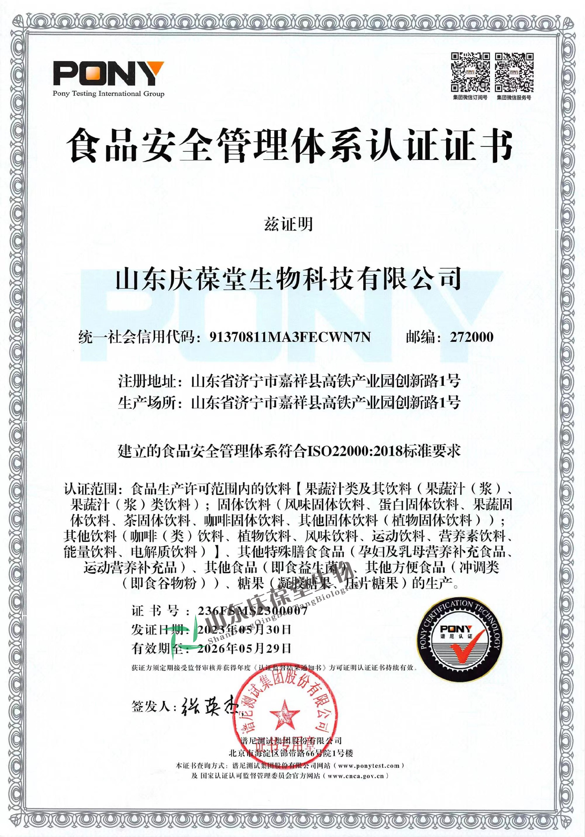 | 食品安全管理體系認(rèn)證證書 |